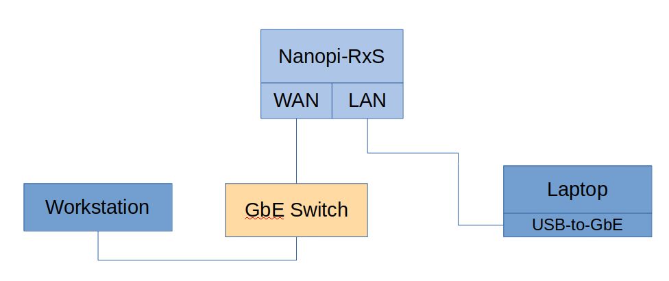 As you can see from the above diagram the workstation is connected on the GbE switch as also the WAN interface of the Nanopi-RxS (I mean both R2S and R4S). Then the LAN interface, which by default is bridged internally in FriendlyWRT, is connected on my Laptop which is using a USB-to-GbE adaptor as it doesn’t have a LAN connector.
