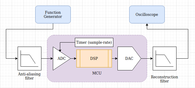 Then it’s the MCU that uses the ADC to sample the input signal, then the DSP software algorithm (in this case the filters) and then the DAC that outputs the processed signal. Also, there’s a timer that triggers the ADC with frequency equal to the sample-rate we need. Then in the output, after the MCU, there’s an optional reconstruction filter, which again is a low pass filter that filters all frequencies above 20KHz. I’ll not use this filter on this test, because I like to see the DAC quantized signal, as I’ve also altering the sampling rate during my tests. Finally, there’s the oscilloscope that displays the output.