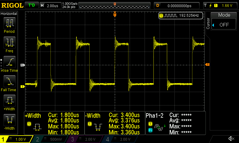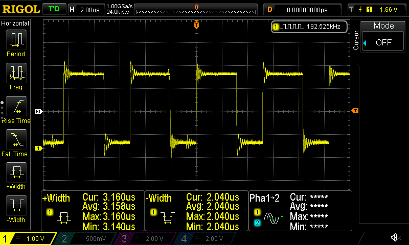 You see that the period between each filter function call is ~5.2 usec, therefore the frequency is 1/5.2 = 192.3KHz, which is the expected sampling rate. Therefore, it’s obvious that the MCU is near it’s limits and we can’t use faster sampling rate, but using the mathlib in this case gives us an additional 3.16-1.8= 1.36 usec to use for other tasks. Neat.