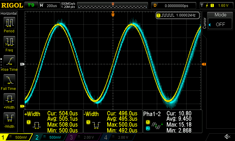 As you can guess, it’s expected to have a phase delay between the input and the output (ADC to DAC) as it needs time to sample, process and convert the input. From my tests this phase shift is around 25 degrees as you can see later in the screenshots, which is just a few micro-seconds.