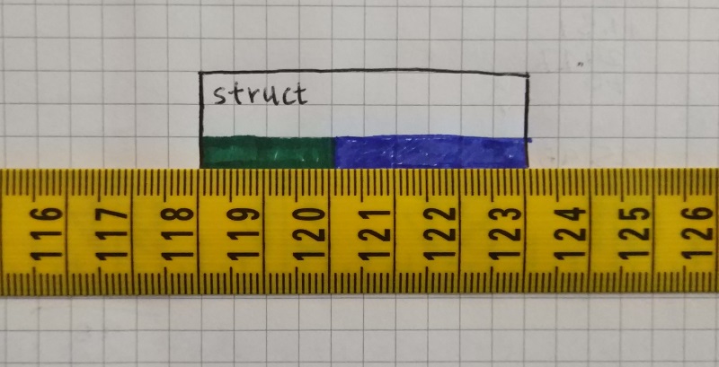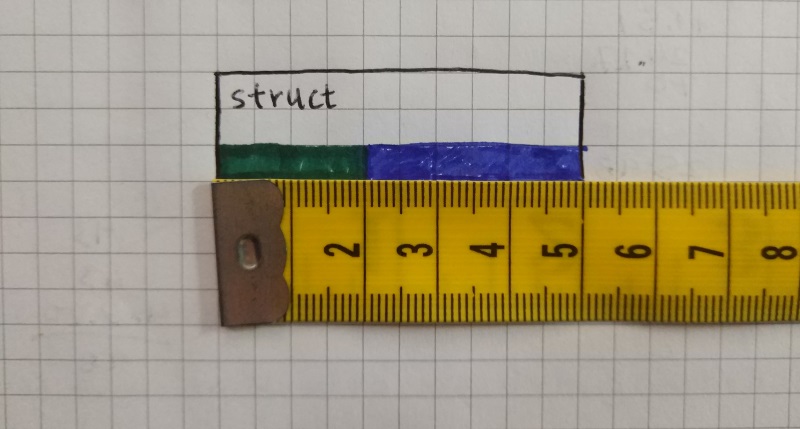 What happened now? You see it’s the same structure but now I’ve slide the tape measure so the offset of the struct starts from zero. Now if I ask, what’s the offset of the blue member, then the answer is obvious and it’s 2.
