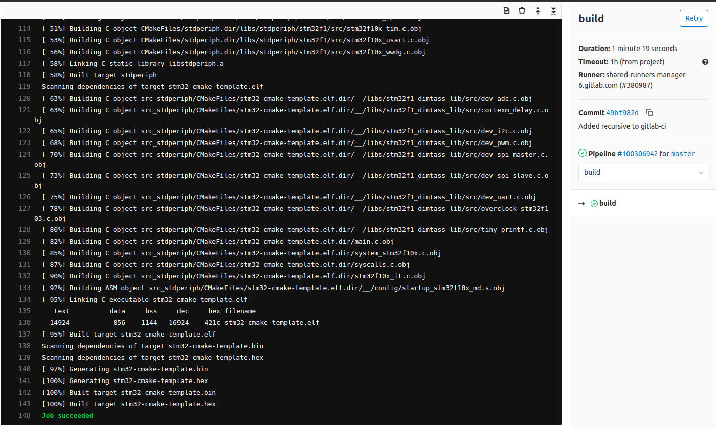 As you can see in the above file, the build-cache will store the content of the build-stm32/src_stdperiph folder during the build stage and then in the test stage will run the file command on this file, which is going to be fetched from the cache. This is the output of this in gitlab:
