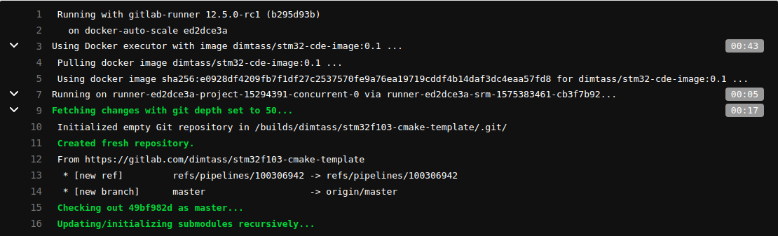 In the first picture, you see the output of the runner and that it’s pulling the dimtass/stm32-cde-image and then fetches the git submodules. In the next image you can see that the build was successful and finally in the third image you see that both build and test stages completed successfully.