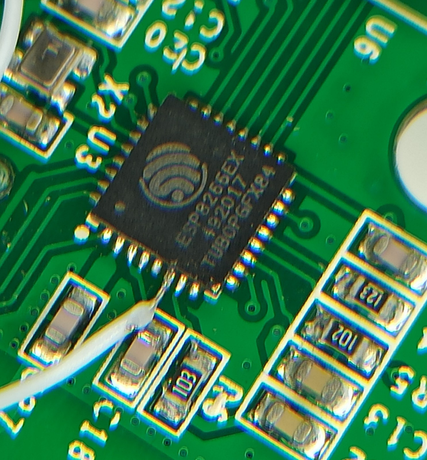 Then I guess the most difficult thing would probably be to solder the wire from the voltage divider to the ADC pin of the ESP8266, because the pin on the IC is barely visible. Although I’m using a quite flat and big soldering tip on my weller, the trick I do is to melt just a bit solder on the wire end, then place the wire on the pin and finally touch it quite fast with the solder iron tip. I can’t really explain it more, but anyway for me it works fine.