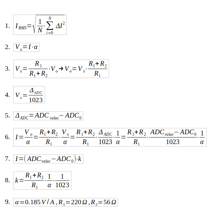 Reading the ADC value is the easy part, but there are a couple of things that you need to do in order to convert this value to something meaningful. Since I’m measuring AC current, then a snapshot of the ADC value is meaningless as it oscillates around 0V and also takes negative values. In this case we need the RMS value, which is the root-mean-square value. Before continuing further, I’ve compiled this list of equations.