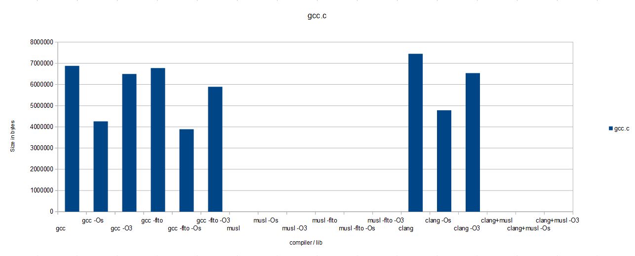 Now that we have the results we need to analyze them and the best way to do that is to visualize the data in a way that’s easy to compare the results. For that reason I chose to plot the size for each file against the compiler and the lib it was used and the last plot is the sum of all the output file sizes, except the gcc.c which was failed to build with the musl lib. Click on each image to zoom in.