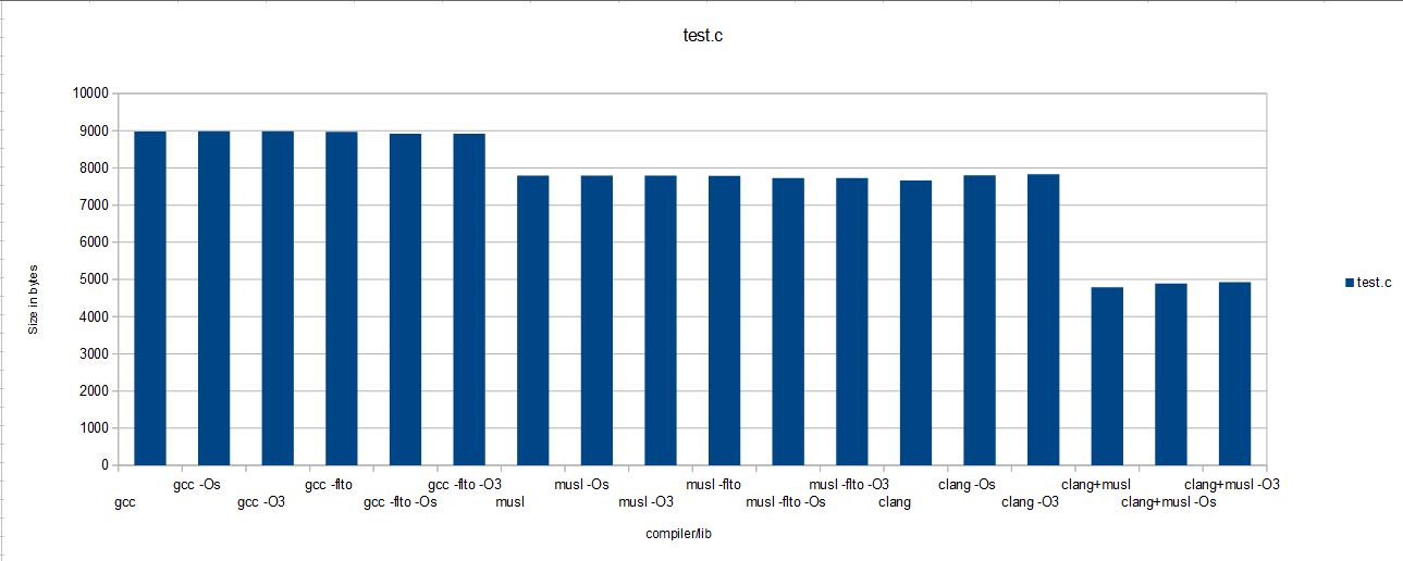 From the things I’ve seen my opinion is that the LTO combined with the -Os does the most significant difference compared the other options. That means that the gcc compiler optimizations outperform clang and also it seems that musl doesn’t give much more compared to glib. Of course the last statement isn’t always true. Musl does make a huge difference on some programs (test.c) and it doesn’t make on others (oggenc and bzip), but also it failed to build gcc. I think musl looks promising though. On the other hand clang results were very mixed. On a simple application test.c it produces really small binary and outperforms all the other options but when the things get tough in more complex code, is worse that gcc.