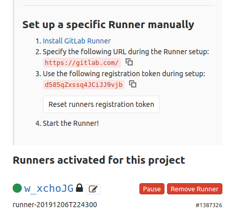 If you think that you can just spawn 10 of these containers now, then don’t get excited because this can’t be done. You see, the runner was registered during the Ansible provisioning state, so at that point the runner got a token, that you can verify by comparing the /etc/gitlab-runner/config.toml configuration and your project’s gitlab web interface in the Settings -> CI/CD -> Runners. Therefore, if you start running multiple containers then all of them will have the same token.