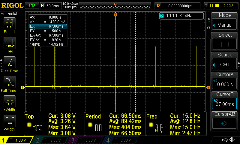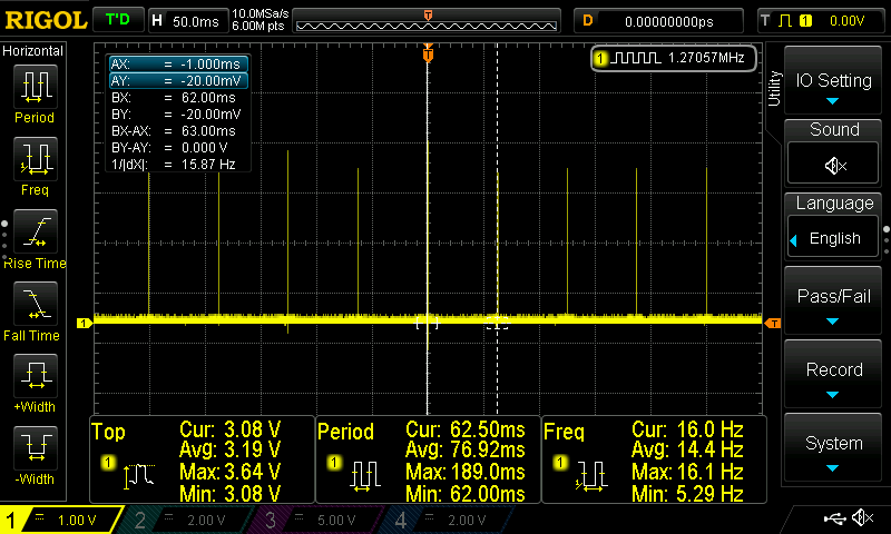 The oscilloscope now shows an average period of 62.5ms, which is a bit faster compared to the raw read/write from bash in the first example, but the difference is too small to be significant.