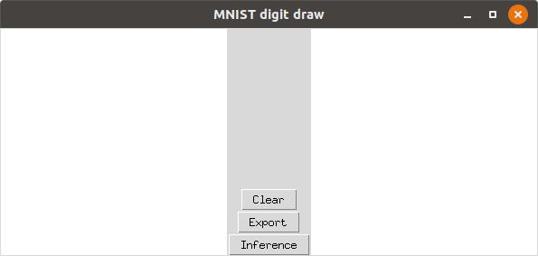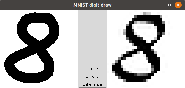 In the left window you can draw your digit by using your mouse. When you’ve done then you can either press the Clearbutton if you’re not satisfied. If you are then you can press the Inferencebutton which will actually convert the digit to the format that is used for the inference (I know think that this button name in not the best I could use, but anyway). This will also display the converted digit on the right side of the panel. This is an example.
