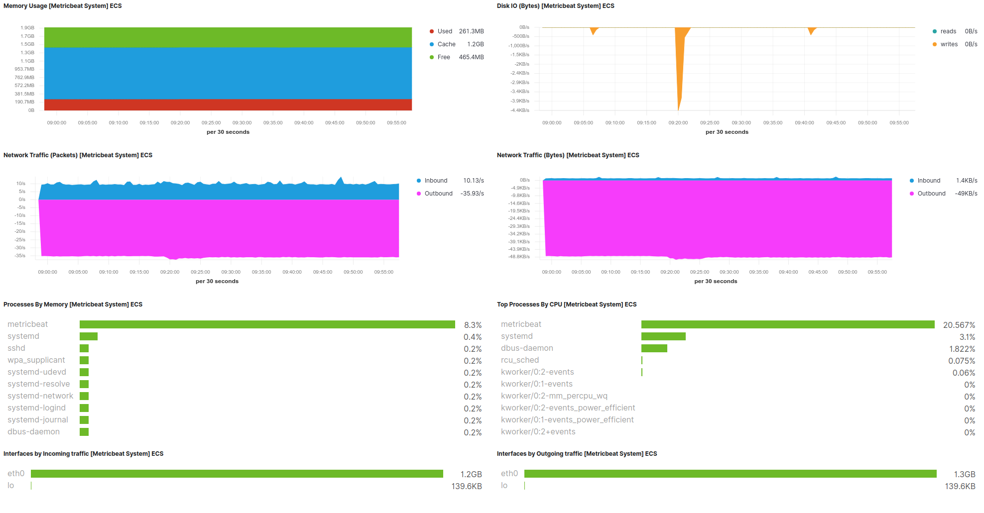 At this point, we have a running instance of an Elasticsearch server, a Kibana server and a ready-to-go SBC with the metricbeat client. Next thing to do now is to run the metricbeat client and start collecting data in the server. As I’ve mentioned earlier the deb file also installs a service file, so you can either run the executable in your terminal or even better enable and start the service.