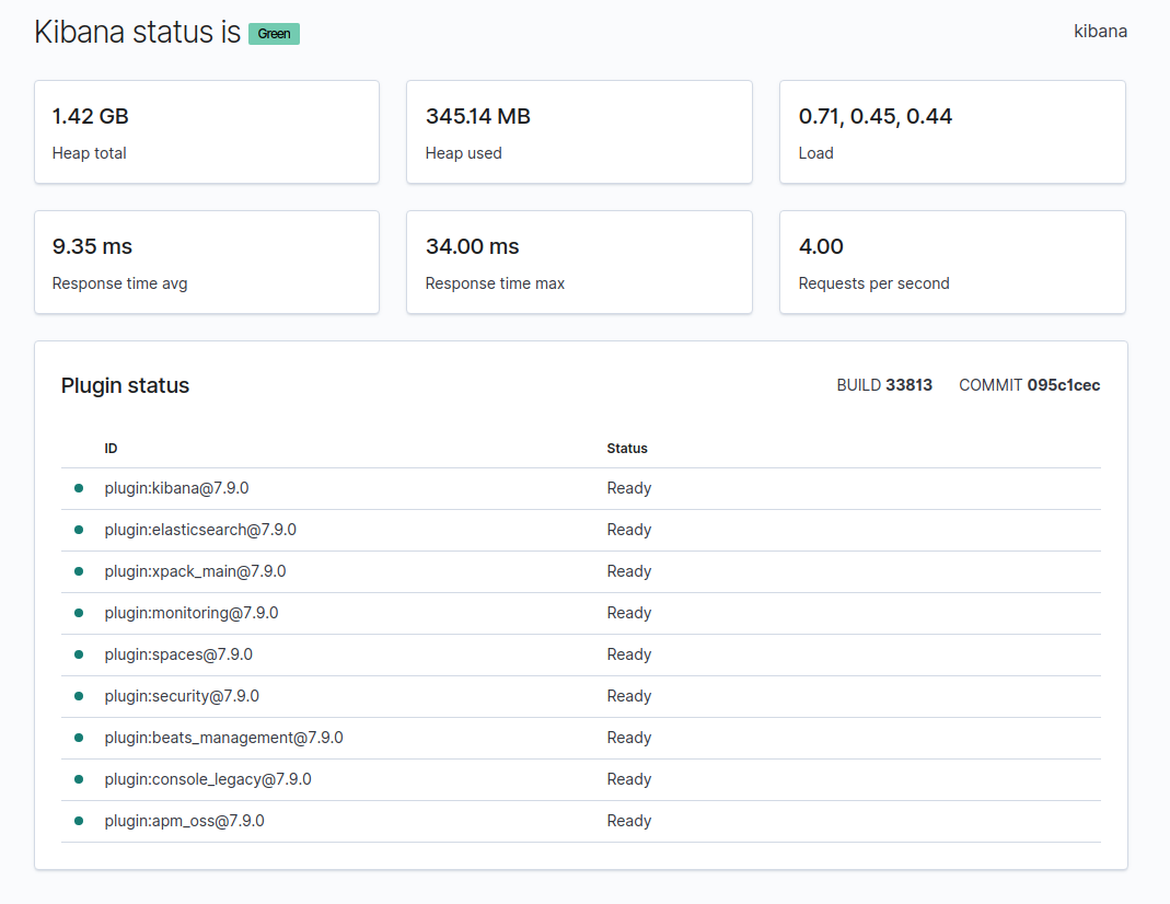Everything should be green, but most importantly plugin:elasticsearch needs to be in ready status, which means that there’s communication between the Kibana app and the Elasticsearch server. If there’s no communication and both instances are running then there’s something wrong with the network setup.