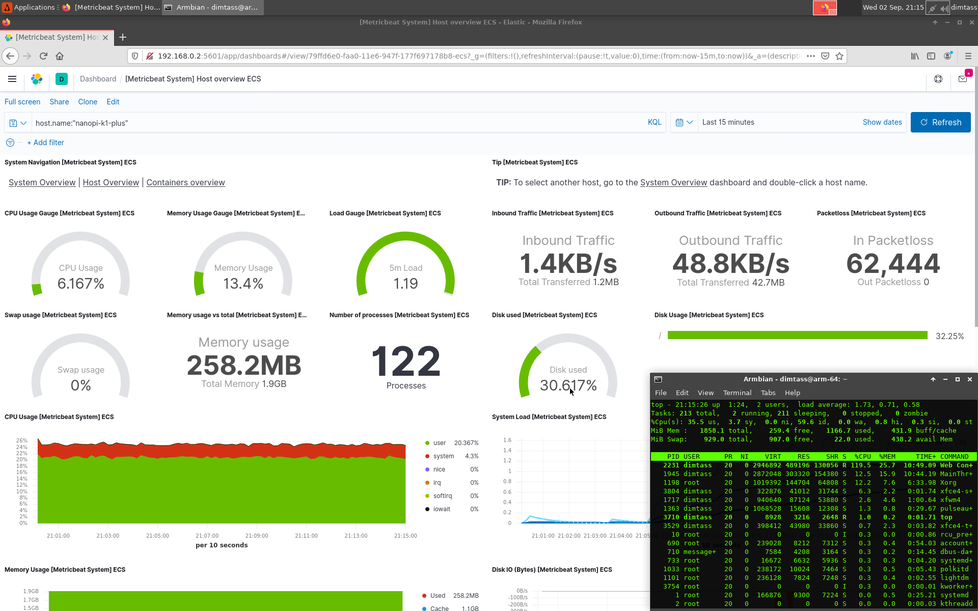 Well, that’s it! Now I can monitor my nanopi-k1-plus SBC using the Kibana web app. In case you have many SBCs around running, you can monitor all of them. Of course, monitoring is just one thing you can do. There are many more things that you can do with Kibana, like for example create alerts and send notifications using the APM interface. So, for example you can create alerts for when the storage is getting low, or communication is lost or whatever you like using the available data from the remote host in the server’s database. As you understand there’s no limit in what you can do.
