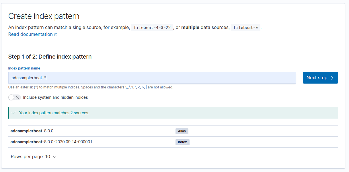 If you already see those sources that you can select from in your results, then it means that it’s working. So no you need to type adcsamplerbeat-* in the index pattern name like this: